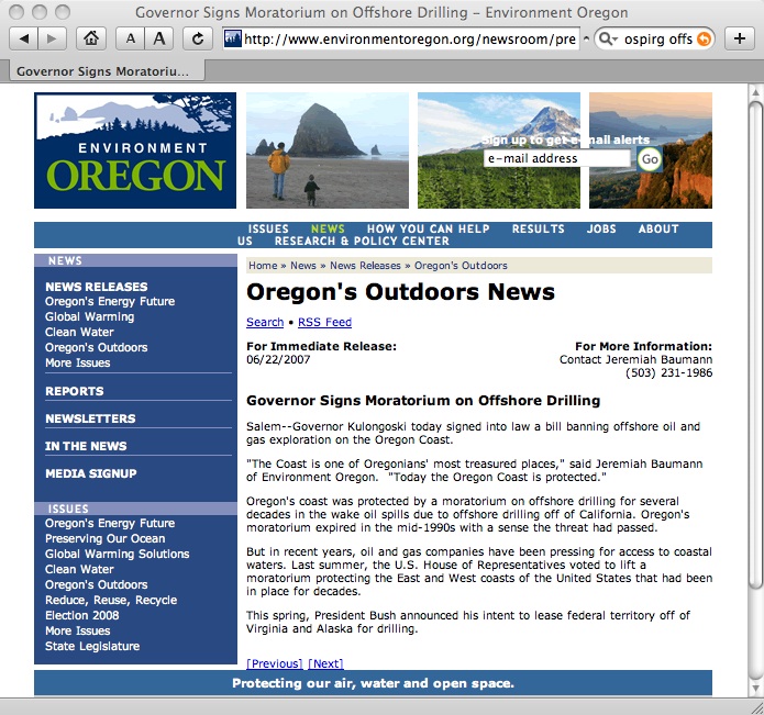 One of the campaigners behind this effort claims that there might be a small amount of oil off the coast, and in the future, methane hydrates might be mined from the sea floor, so the drilling moratorium is still a good idea. Perhaps one day, methane hydrate extraction might become a major threat to the coast (and to the climate, since methane is a potent greenhouse gas). However, searching for "peak oil" on the "environmentoregon.org" website turns up a blank result. Most of the foundation funded environmental groups act as de facto divisions of the Democratic Party, and since the Democrats don't want to talk about Peak Oil, these groups ignore it, also.